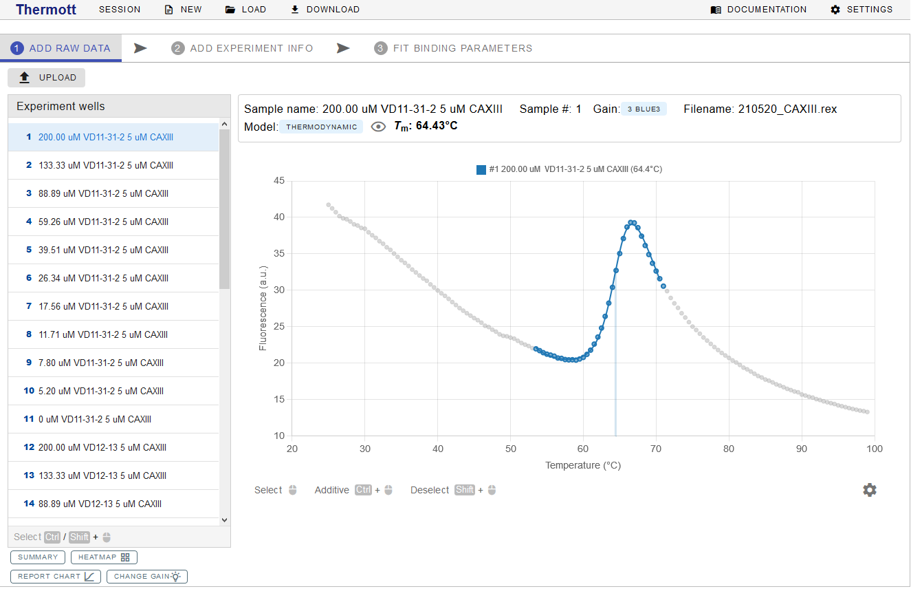 Consequently, data will be uploaded, parsed and melting curves fitted to the experiment data. Successful upload prompt will appear briefly and processed data with protein melting curves should appear on the screen.