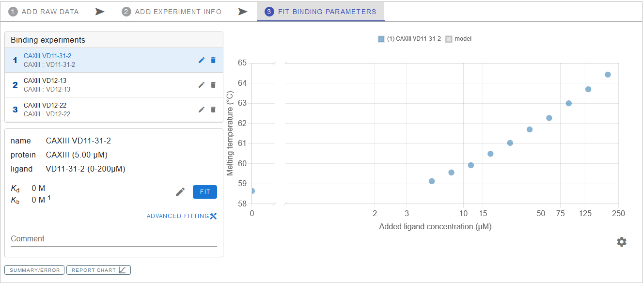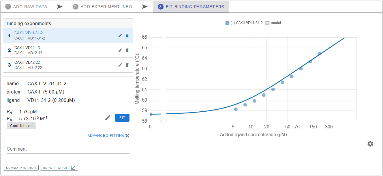 On the left side under the Binding experiments you can find the list of your experiments that were created in the previous step. Clicking on the experiment from the list causes all the data points from the experiment to appear as a graph on the right panel. If everything was filled-out correctly, pressing FIT button will yield a plot of a fitting Kb/Kd model across the experiment data points and calculated Kb and Kd values, displayed below the experiment list.