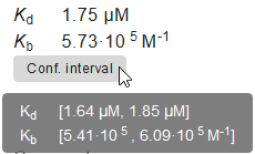 Error values (more specifically, data confidence intervals) for the experiment are calculated automatically and can be accessed by pressing Conf. interval, which is located below the Kb/Kd values.