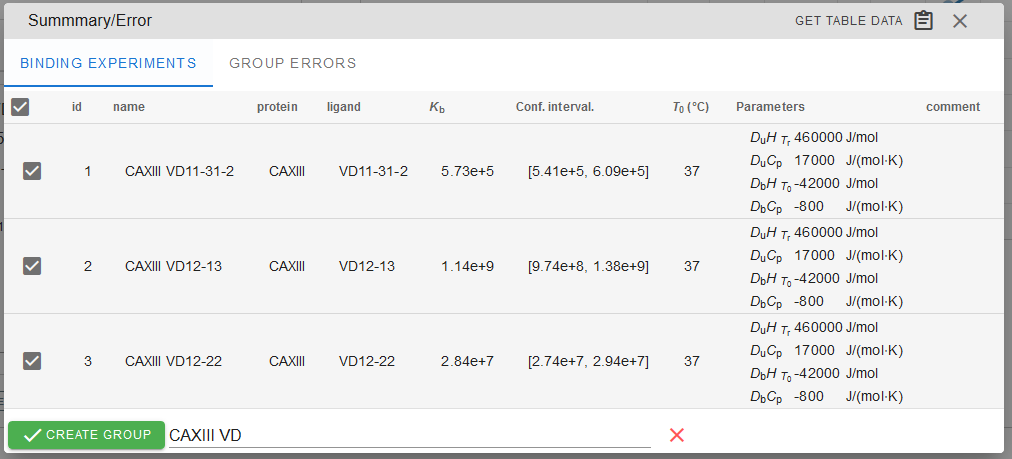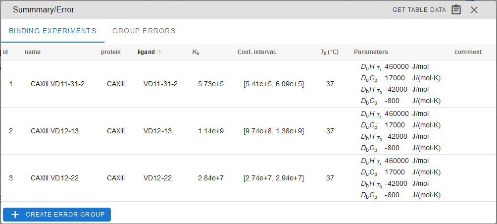 SUMMARY/ERROR allows to see the summary of the binding experiments, copy information from the experiment table or GET TABLE DATA (to save it as a CVS file or copy it to the clipboard).