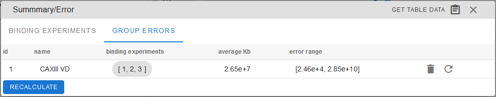 In the GROUP ERRORS tab, you can see the average Kb value for the created group of experiments and the calculated error range for the group. It is useful when you need to obtain the average value from several replicates. A group can be deleted by pressing the adjacent trashcan icon.
