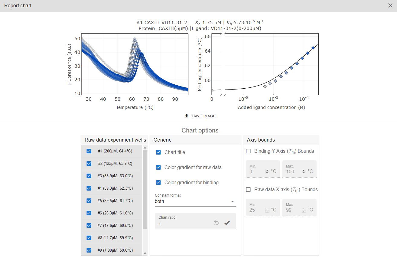 REPORT CHART will generate a report chart for your convenience. There you can select any data (Raw data experiment wells) to be represented in the report with some additional graphic/visualisation options. Report image can be saved as SVG or PNG file with the SAVE IMAGE button.